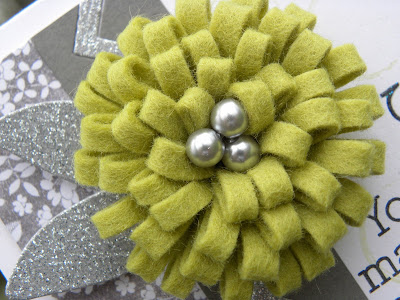 Then roll it up tightly and glue down the end with a dab of hot glue. (I also put a thin layer covering the bottom of the flower since there was so little glue used in the rolling. You don't have to put anything in the center, but if you want to, just be creative...I used some silver pearl beads. Here is how it worked into the card...
